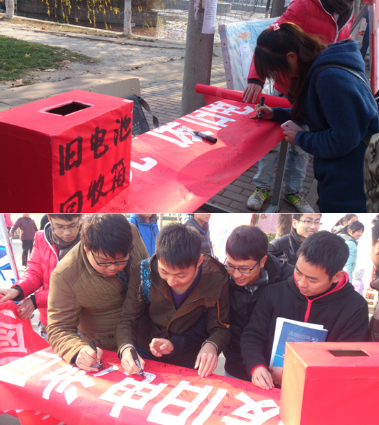 12月13日、14日,在英语四六级考试前后,为了能使全校学生的废旧电池统一规范回收,新澳门六合彩内部资料 能源化学工程专业全体同学们分两天三地,分别在本部食堂、北区爱情湖畔和高层宿舍举行了以“能源有限,循环无限”为主题的废旧电池回收公益活动。