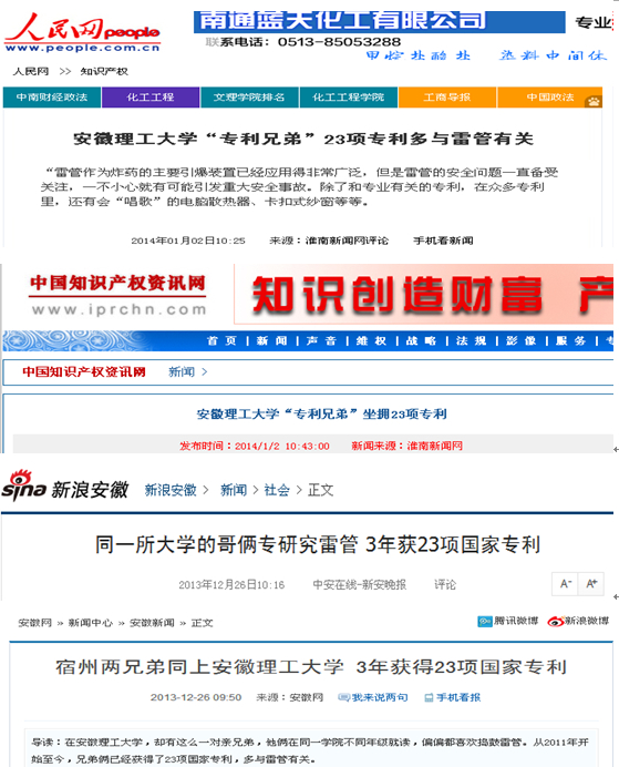 2013年12月26日,安徽网以“宿州两兄弟同上安徽理工大学,3年获得23项国家专利”为题进行了报道。随后,人民网、中国知识产权咨询网、中国招商引资网、商标新闻、新浪网安徽新闻、中国网魅力安徽、中安在线、安青网、安徽交通信息服务网、淮南市人民政府网、淮南报业新闻网、淮河风情网、芜湖新闻网、鸠兹网、万家热线、阜阳公众网、大宿网今日宿州、宿州在线、枞阳在线、萧县在线也以“同所大学亲兄弟专研究雷管,3年获23项国家专利”、“安徽理工大学‘专利兄弟’23项专利多与雷管有关”、“安徽理工大学‘专利兄弟’坐拥23项专利”等题目进行了转载报道。
