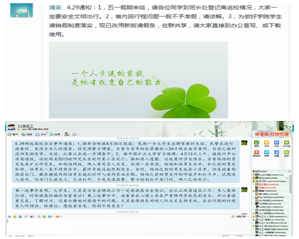 新澳门内幕论坛 安全工作组对春夏季防溺水、春季出行、就业防骗、突发事件、运动安全、宿舍防盗、心理健康、个人卫生等学生中易发安全问题进行了逐一梳理,新澳门内幕论坛 通过主题班会、网络宣传、手机信息、深入核查、当面教育等多种手段,努力做到学生安全教育的多方位、全媒体覆盖。新澳门内幕论坛 辅导员利用QQ、微博、微信、班级云等社交媒体,结合典型学生安全事件案例,教育引导学生安全、愉快过好大学生活,大大提升了传播、教育实效。