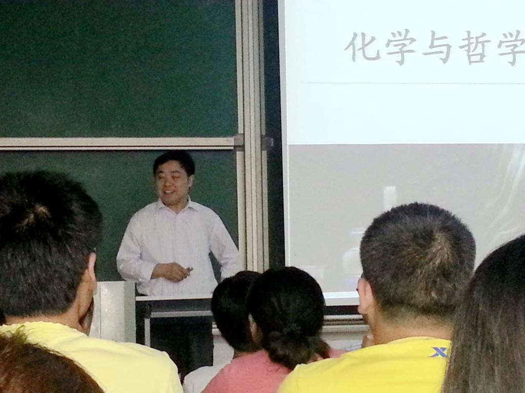 何杰教授的报告题目是“化学与哲学”, 从世界的形成是一个化学过程、化学中的变化、平衡哲学、存在模式理论、量变与质变的辩证关系等五个方面,旁征博引,删繁就简,用诙谐的语言充分说明了化学是理解自然的真正钥匙,对化学和哲学间的微妙关系进行了全面解读。