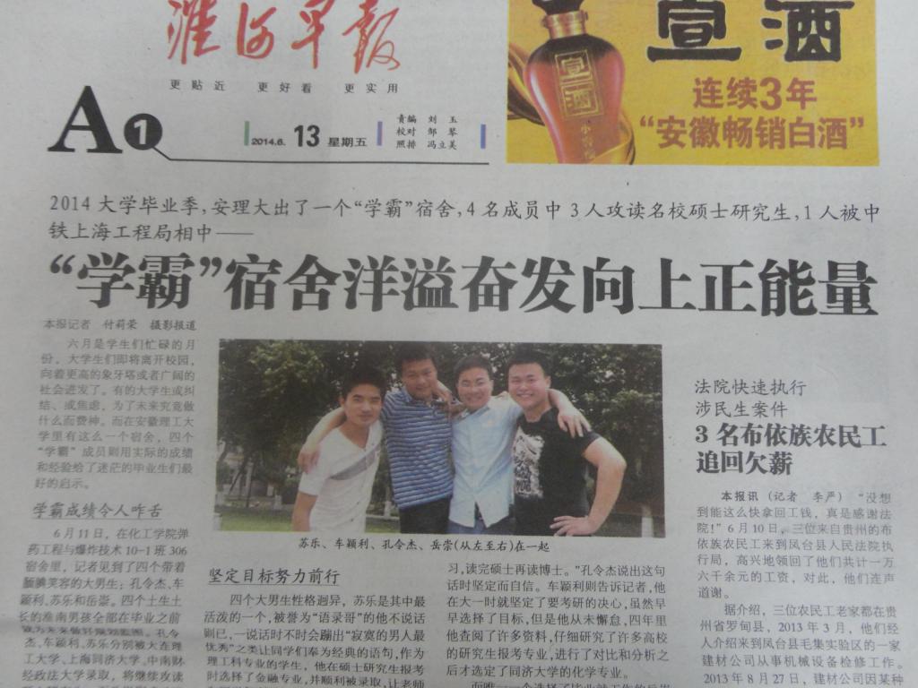 在新澳门六合彩内部资料 有这样一个“学霸”宿舍,他们同住在高层公寓10306宿舍,4名成员中3人考上名校研究生,1人签约大型国企,他们的事迹一时引起社会的关注。6月13日,《淮河早报》在A1版头条详细报道了“学霸”宿舍“男神”们的奋斗历程,这个榜样宿舍用骄人的成绩为学弟学妹们留下了最好的经验和启示。