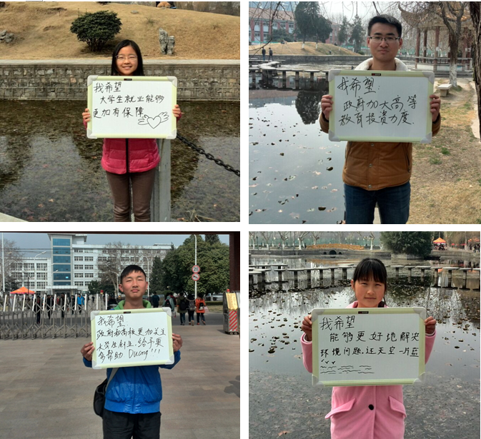 有的同学说“这几年污染严重,大气污染、土地污染,甚至之前“天蓝水绿”的农村环境也开始变的糟糕起来,希望政府能积极治理。”有的说“现在就业形势日益严峻,不知道两年后我们该何去何从,希望学校和社会能拓展更多就业渠道,让我们顺利就业。”有同学认为“随着经济的发展和时代的变迁,传统民俗正在流失,希望能有更多的人关注和保护传统文化。”还有的说“两会”的委员应该多到人民群众中来走一走,看一看,多了解当地的实情,多听群众呼声,通过他们的声音,让老百姓看得起病,物价下降,环境优良,食品放心。”