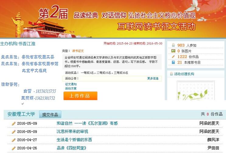 为更好地做好安徽省第二届“品读经典,对话信仰,弘扬社会主义核心价值观”互联网读书征文活动,读书节组委会开展了红色经典读后感征文活动,以此引导大学生学习理解“社会主义核心价值观”的深刻含义,始终牢记共产主义信仰,做祖国合格的建设者和可靠的接班人。目前从收集到的30件作品中,择优选拔了薛凤洋等8位同学作品推荐参加安徽省征文比赛。