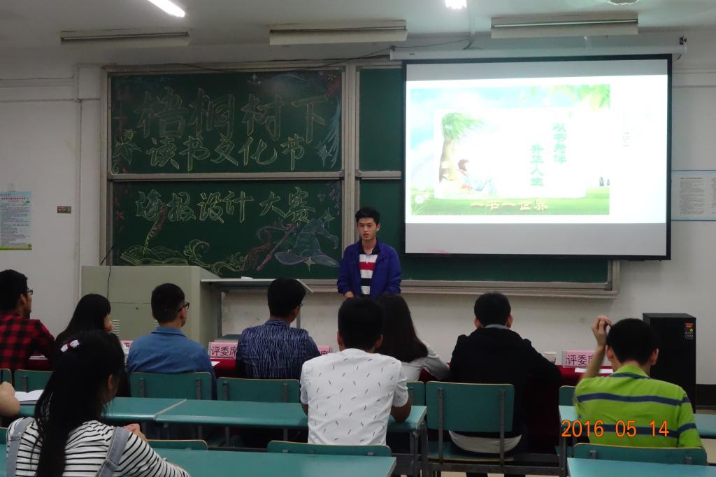 5月14日晚,海报设计大赛在北实201教室举行,本次比赛要求参赛作品属选手原创,具有创新性并紧扣主题。通过赛前的海报筛选,微信投票及作品展览,共有12幅作品脱颖而出,参加最终的现场答辩。比赛规则是根据抽签顺序分为两组依次比赛,每位选手有5分钟的阐述时间,之后是评委提问。比赛过程中,各位选手对海报内容进行详细介绍和不同层面的解读,并结合海报阐述自己对读书的认识以及阅读的意义。最终,数字媒体技术15-1王婷作品《Think》和弹药14-3班周淑清作品《寻光》凭借新颖的设计获得一等奖,土木15-6班肖芳萍《知识无涯》等3件作品获二等奖,弹药15-2班许行健《文字描绘的世界》等4件作品获三等奖。