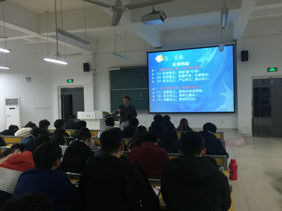 为了提升大学生社交礼仪水平和就业能力,营造迎接本科教学审核评估的和谐校园氛围,11月30日晚,化工新澳门内幕论坛 在明理楼101教室举办了社交礼仪专题讲座,邀请校毕业生就业工作处处长谢振安主讲。全院200余名师生听取了讲座。讲座由新澳门内幕论坛 党委副书记徐泽绵主持。