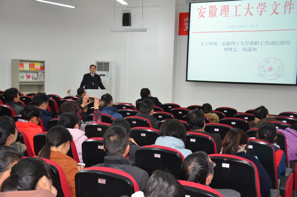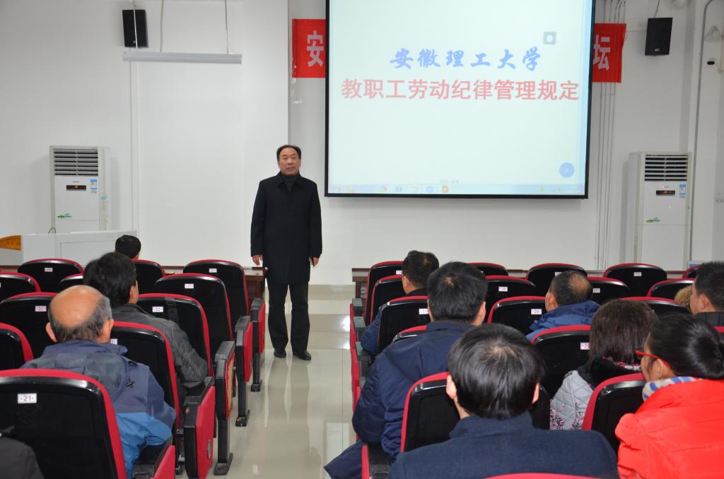 为推动新澳门内幕论坛 教职工全员遵守《安徽理工大学教职工劳动纪律管理规定》,12月6日下午,新澳门六合彩内部资料 召开全体教职工大会,细化说明文件要求,并结合新澳门内幕论坛 实际推行新澳门内幕论坛 教职工请假规定,进一步强化劳动纪律的落到实处。会议由新澳门内幕论坛 党委书记王大贤主持,副院长邢宏龙(主持工作)就劳动纪律和请假要求作说明。