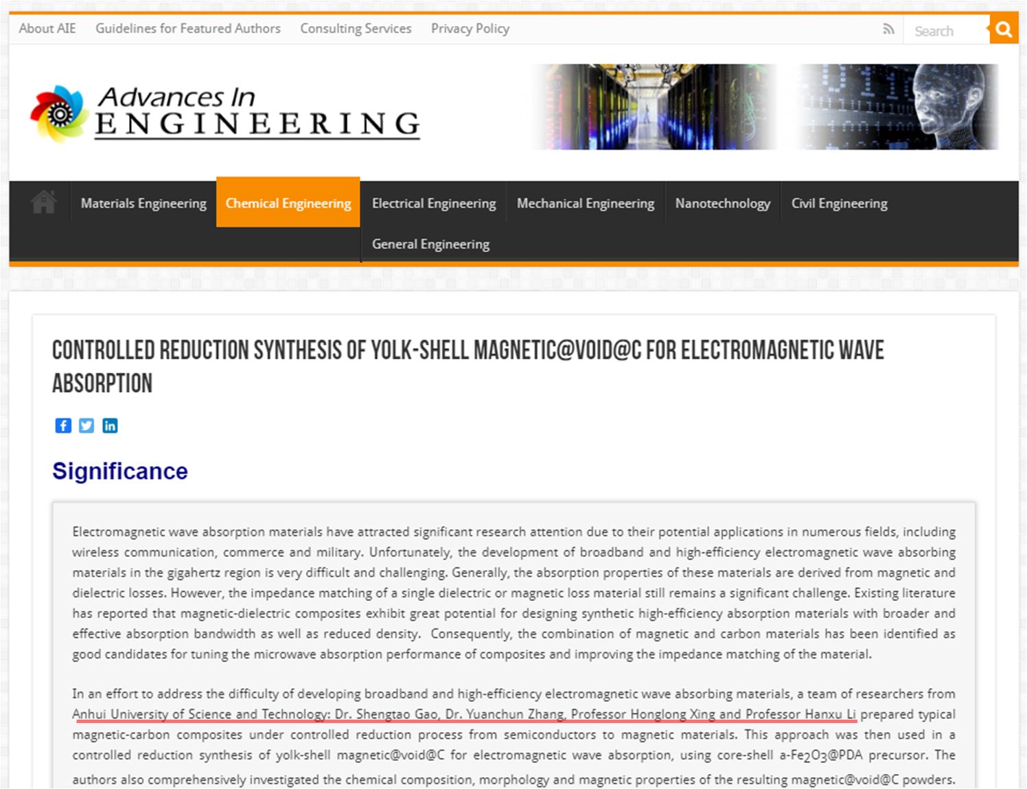 近日,我校高圣涛老师、张元春博士、邢宏龙教授、李寒旭教授等人发表在Chemical Engineering Journal(IF = 10.7,ESI工程学学科期刊,中科院一区Top期刊)上的学术论文(Controlled reduction synthesis of yolk-shell magnetic@void@C for electromagnetic wave absorption)被国际著名科技机构“工程进展”(Advances in Engineering, AIE)遴选为关键科学文章,并进行了重点报道。