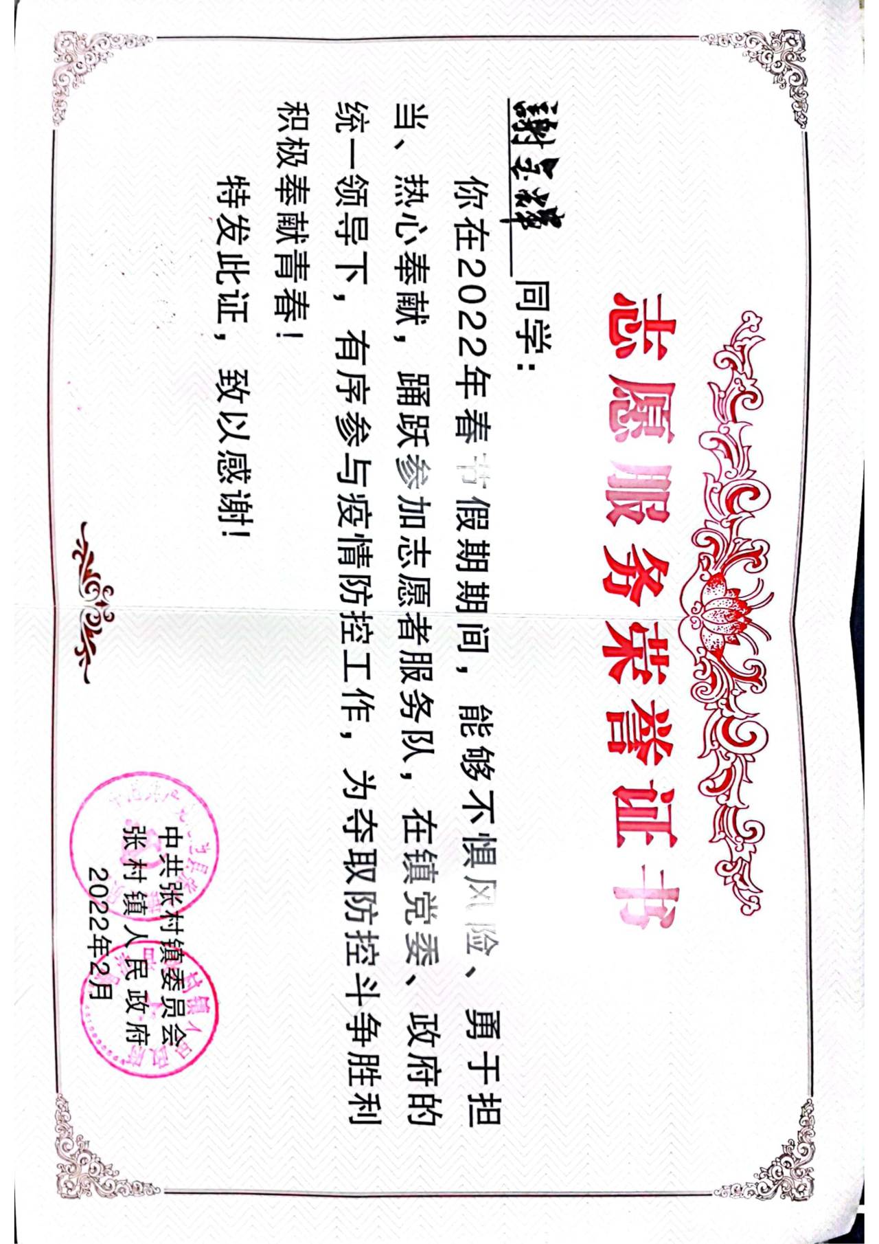 化工新澳门内幕论坛 谢金辉同学参与防疫志愿服务受表彰