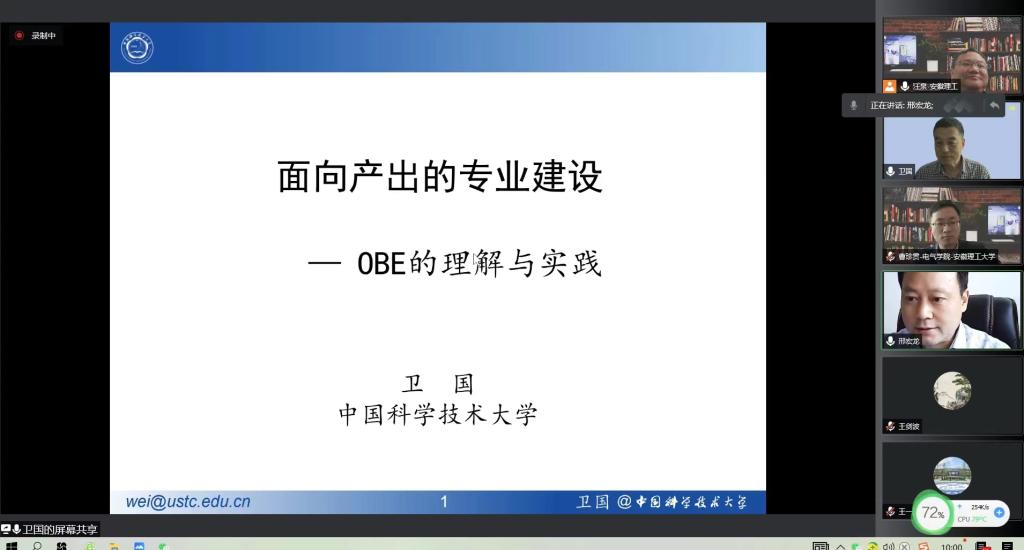 4月18日上午,应教务处和新澳门六合彩内部资料 邀请,中国科学技术大学卫国教授作题为《面向产出的专业建设—OBE的理解与实践》的线上工程教育认证专题辅导报告。新澳门六合彩内部资料 院长邢宏龙教授主持报告会。