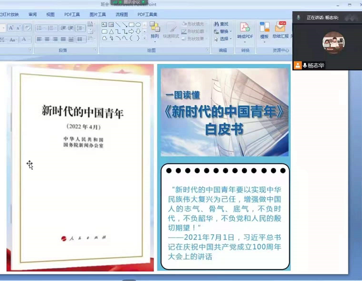 5月4日下午,化工新澳门内幕论坛 团委老师杨志华老师通过腾讯会议带领新澳门内幕论坛 团员青年认真学习《新时代的中国青年》白皮书。他介绍了新时代中国青年生逢盛世共享机遇、素质过硬全面发展、勇挑重担堪当大任、胸怀世界展现担当等四个部分的主要内容,并结合当前校园疫情防控中青年人的担当和奉献,阐释新时代中国青年肩上的重任,引导广大青年苦练专业本领,提高综合素质,时刻准备为中华民族的伟大复兴奉献青春力量。