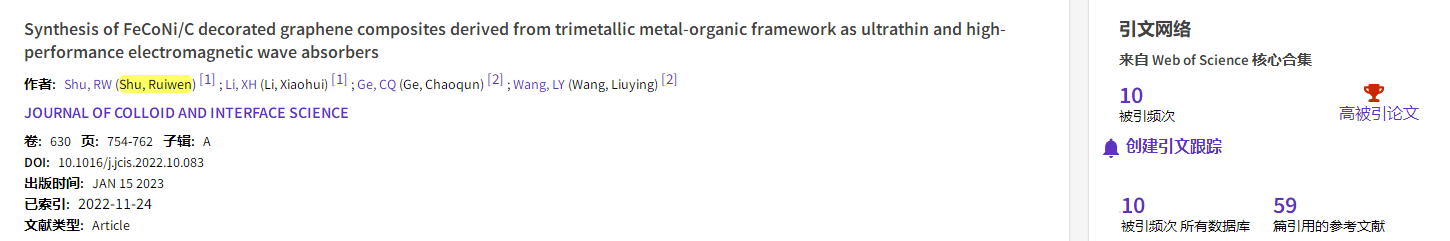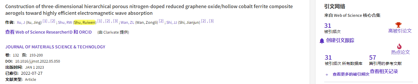 据2023年5月ESI数据库显示,我校新澳门六合彩内部资料 教师疏瑞文等人以安徽理工大学为第一单位在《Journal of Materials Science & Technology》(影响因子:10.319,JCR/中科院分区双一区TOP期刊,中国科技期刊卓越行动计划重点期刊)期刊上发表的研究论文“Construction of three-dimensional hierarchical porous nitrogen-doped reduced graphene oxide/hollow cobalt ferrite composite aerogels toward highly efficient electromagnetic wave absorption”被ESI数据库遴选为高被引论文和热点论文,《Journal of Colloid and Interface Science》(影响因子:9.965,JCR/中科院分区双一区TOP期刊)期刊上发表的研究论文“Synthesis of FeCoNi/C decorated graphene composites derived from trimetallic metal-organic framework as ultrathin and high-performance electromagnetic wave absorbers”被ESI数据库遴选为高被引论文。