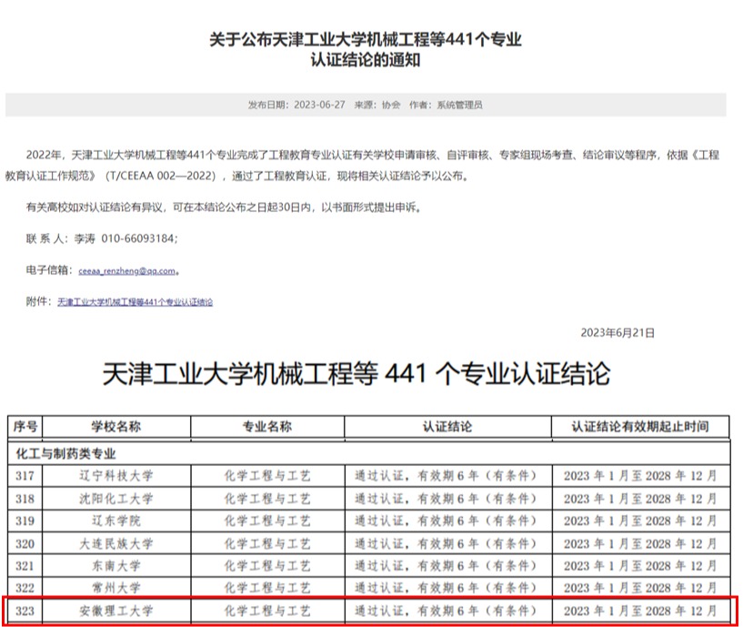 近日,中国工程教育专业认证协会公布了《关于公布天津工业大学机械工程等441个专业认证结论的通知》,我校化学工程与工艺专业完成学校申请、自评审核、专家组线上考查、结论审议等程序,通过了2022年工程教育专业认证,有效期6年(2023年1月至2028年12月),代表着我校化学工程与工艺专业建设取得阶段性成效,彰显了该专业的工程教育质量得到充分认可,标志着专业质量实现了国际实质等效。