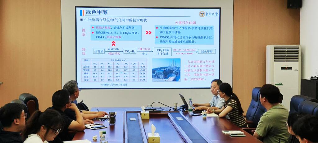 马隆龙教授在报告中介绍了可持续生物燃料在储氢方面的巨大潜力和优势、国内外技术现状、绿色甲醇等可持续生物燃料高效储氢新型技术及工艺;随后,马隆龙教授指出木质纤维素制航油存在能耗高、选择性较低等难题。因此,其团队提出基于水相催化制备生物航油—醛酮技术路线耦合新单元技术,为开发可持续生物燃料提供基础理论与共性关键技术支撑。报告的最后,马隆龙教授与参会师生就木制素解聚制特种航油的可操作性、如何结合安徽省资源对生物质实现利用转化、油脂基生物航油与木质素解聚产物结合降低冰点、通过调整氢碳比提高木质素解聚产物热值、航空燃油中链烃和环烃的平衡等问题展开了深入的讨论和交流,对青年教师、研究生提出了宝贵的意见和建议。