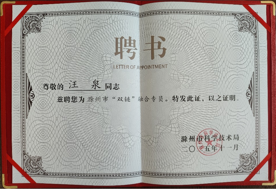 之后,滁州市政府举行“双链”(产业链与创新链)融合专员聘任仪式,新澳门内幕论坛 汪泉院长与其他11位来自高校和科研院所的专家一同获聘为“融合专员”。