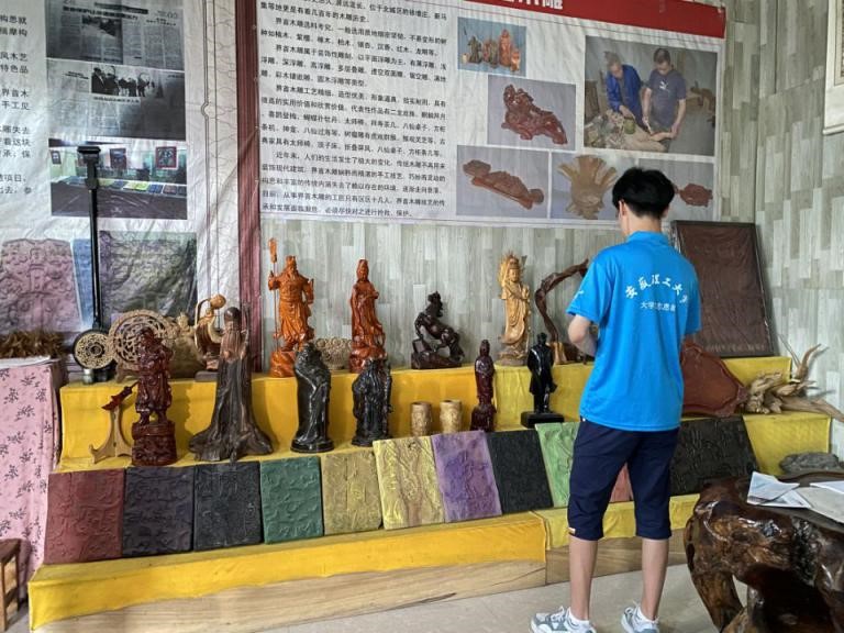 7月15日上午,调研团成员来到了界首市非遗木雕、木版年画传承培训基地。团队成员在木版年画徐师傅的指导下亲自体验了单色印刷。在学习和体会木版年画的印刷的同时,实践团成员还拜访了木雕技艺传承人老师傅,他为众人介绍了木雕木料的选材、雕刻、工具等内容,师傅用简易的工具配合精巧的着力技法将人物形体及表情雕刻的栩栩如生,让实践团成员深刻体会到匠人匠心的独特含义。