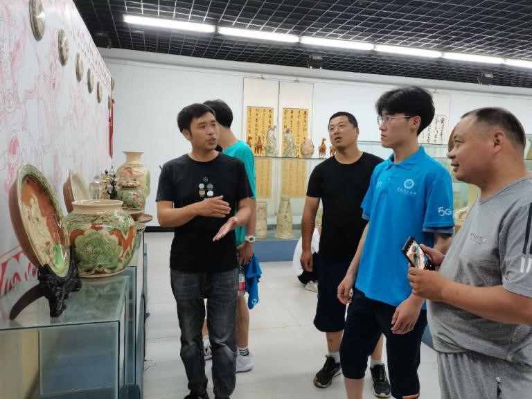 7月16日上午,调研团队来到界首市彩陶体验基地,了解制陶工艺。相关工作人员介绍,彩陶的制作较为繁琐,从挑选沙河泥土、练泥、制胚、上化妆、刻花再到素烧、施釉直至釉烧共有多个流程,其历时将近一个月的时间,如此繁杂的工序换来的是每一个彩陶的独一无二和精美绝伦。
