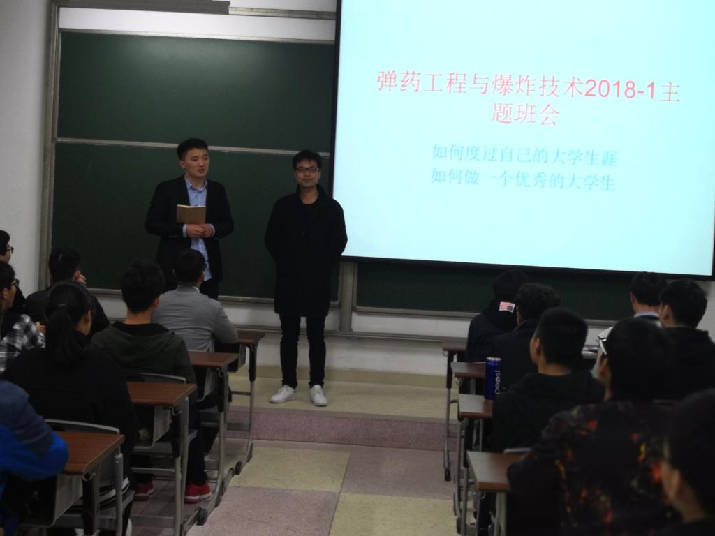 11月11日晚,弹药工程与爆炸技术2018-1班全体成员在天工北409教室以“如何度过自己的大学生涯、如何成为一名优秀大学生”为主题召开班会。班会由弹药18-1班班主任杜明燃老师主持。能源与安全新澳门内幕论坛 优秀班主任、校道德模范提名奖获得者庞冬冬老师,2016级安全工程专业优秀学生袁昌宇、黄玉杰、程文青及2015级弹药、特能专业保研学生赵迪、张欣欣、黄亮亮等应邀作如何踏实高效有意义的度过大学生活的相关报告,并交流学习经验方法。