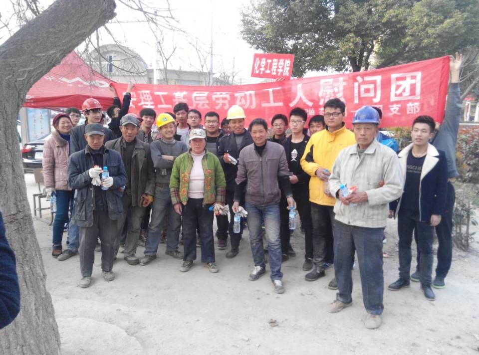 下午3点,大家怀揣着激动的心情来到施工地点。工地附近的环境条件十分恶劣,各位工作人员却在其中默默奋斗,为淮南的建设添光增彩,不免让我们感到一丝心酸。班委找到了工地的门卫师傅,班长代表全班同学向门卫师傅致以敬意和问候并递上了慰问品。