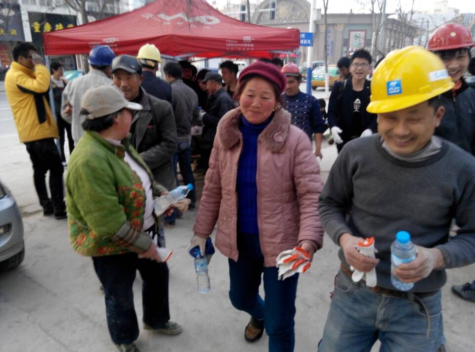 接着,在工地负责人的安排下,同学们分为几小队,分别对散布在工地周围的工人送去塑胶手套,矿泉水等慰问品。面对同学们的突然造访,工人们显得既惊讶又欣慰,纷纷向同学们表达了感谢。最后,在工地负责人号召下,在场的工人与班级同学来了一次大合影,拓下了这次雷锋行动的最后一个篇章。