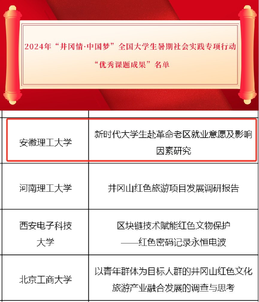 近日,全国青少年井冈山革命传统教育基地管理中心公布了2024年“井冈情·中国梦”全国大学生暑期社会实践专项行动优秀课题成果名单,我校新澳门内幕论坛 牵头完成的课题《新时代大学生赴革命老区就业意愿及影响因素研究》(杨志华、王文涛、代先祥)荣列其中。
