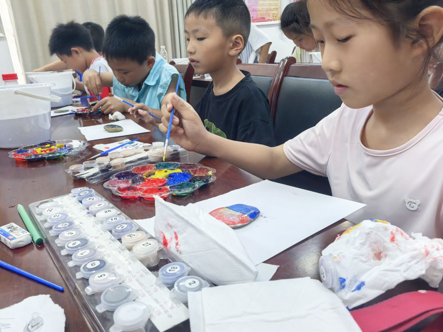 美育课堂上,三原色奥秘与调色游戏唤醒对美的感知,鹅卵石上绽放落日熔金、花鸟翩跹的创意。中国纹样的韵律与《小妖怪的夏天》诗意影像,让传统美学如细雨浸润心扉。