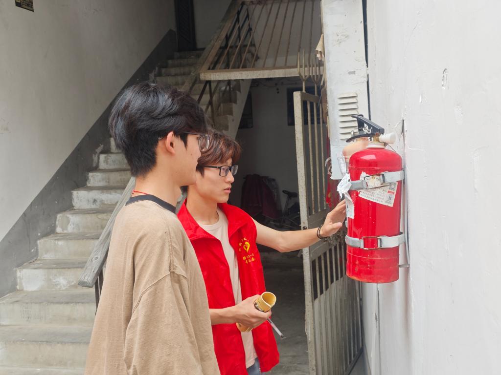 6月30日上午,实践团分成建筑结构、电路安全、消防设施三个小组,对前锋一村进行了全面“诊断”。手持红外测温仪,逐户检测电表箱和插座温度,标记出3处过热点,并记录私拉乱接电线情况;核对压力表、生产日期等,确保消防设施在有效期内。团队成员主动清理楼道杂物,疏通消防通道,用实际行动守护社区安全。