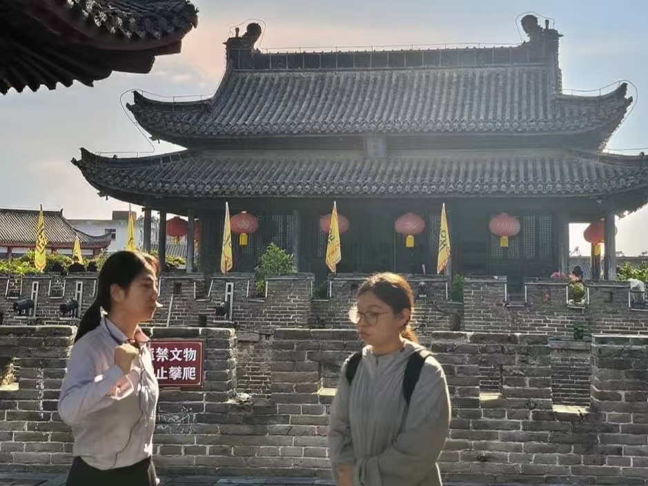 下午,团队登上寿县古城墙,聆听这座“宋城标本”的前世今生。讲解员以城砖铭文为引,解析“糯米灰浆”“丁顺砌法”等宋代营造技艺,还原城墙“高沟深垒、敌台密布”的军事防御体系;从淝水之战到明代护城抗洪,再到抗战时期军民凭墙固守。而城墙上的文创馆,则让这份历史记忆有了更鲜活的表达。当夜晚的灯光点亮古城,传统与现代在此交融,既守护了岁月的沉淀,也让寿县的故事以更亲切、更多元的方式被看见、被记住、被传扬。