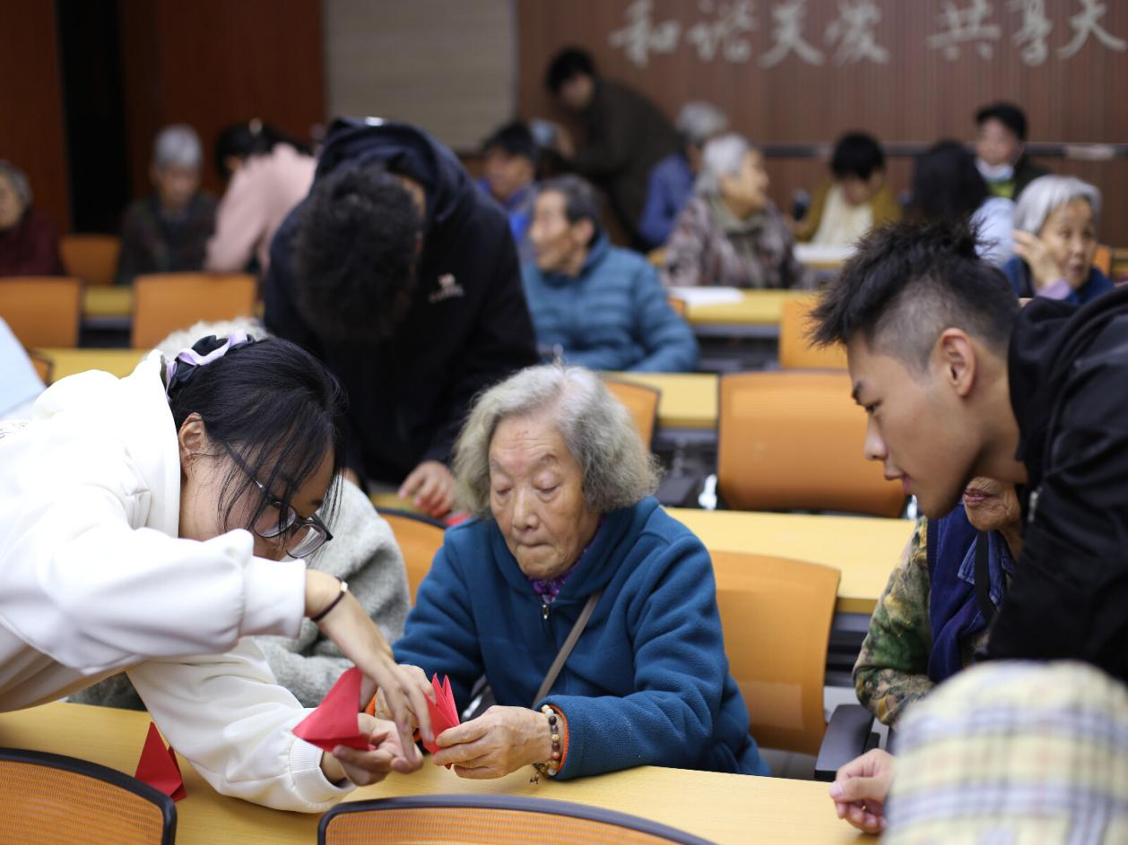 活动现场,志愿者同学集体演唱歌曲《如愿》,悠扬歌声获老人阵阵掌声。分组互动环节,绘画区志愿者协助调色创作,书法区志愿者共书吉祥语,折纸区志愿者陪伴制作纸鹤、莲花。同学们倾听老人讲述往事,氛围温馨祥和。此次互动不仅丰富了老人们的精神文化生活,更体现了青年学子弘扬敬老爱亲的传统美德。