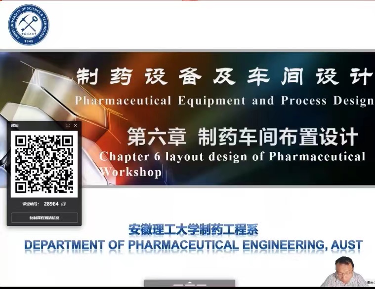 本次示范教学采用雨课堂、同时调用腾讯会议直播方式,教学内容为《制药设备及车间设计》,教学目标是让学生掌握车间设计原则,熟悉原料药“精烘包”工序和制药车间布置设计内容,培养学生工程项目施工和GMP验证实践能力。《制药设备及车间设计》课程专业性强,本次授课内容为第六章车间布置设计第五节原料药“精烘包”工序布置设计。教学过程中,杨忠连老师专业知识丰富、讲授课程游刃有余,语言标准、清晰流畅,知识点之间的衔接、过度自然,重难点突出,充满激情,充分调动学生的积极性,实现了多媒体教学和传统教学的完美结合,确保线上线下教学同质等效。 杨忠连老师合理的教学环节设计和实施得到了线上观摩教师的一致好评。